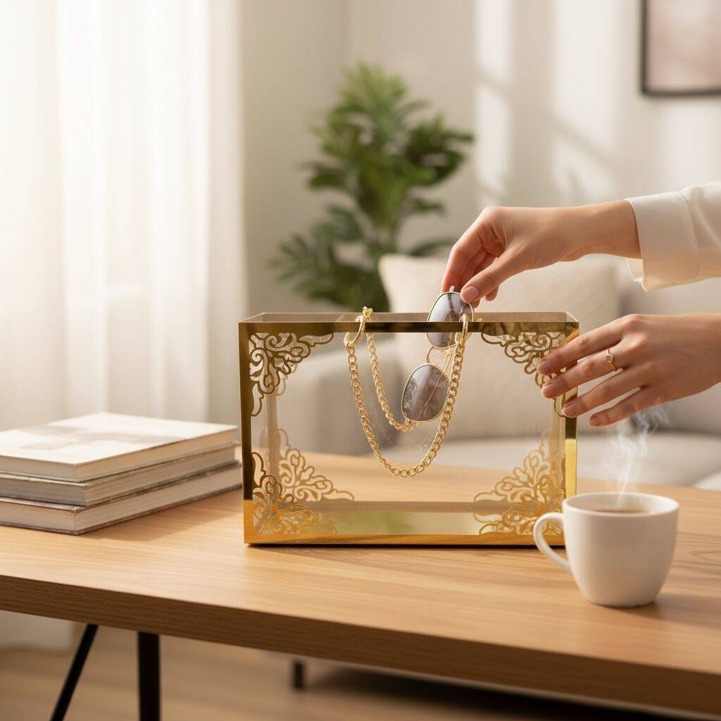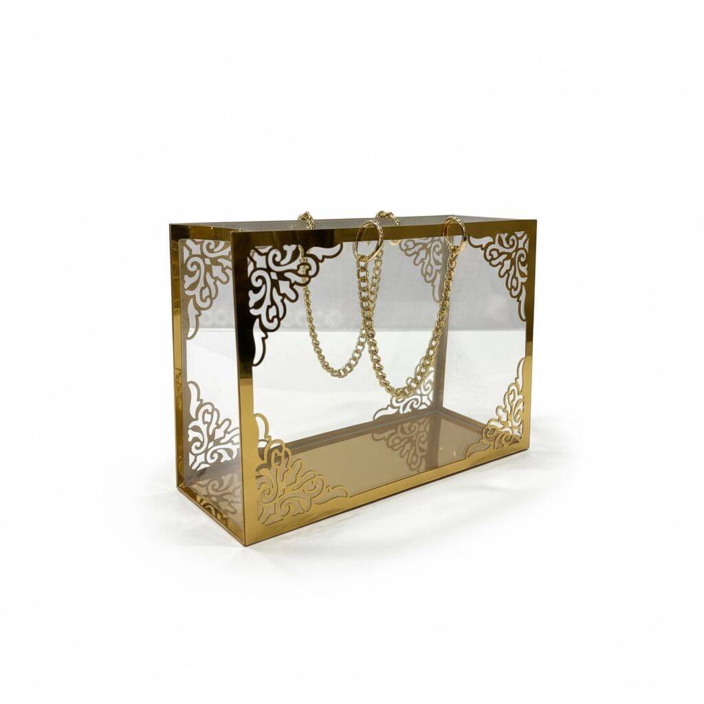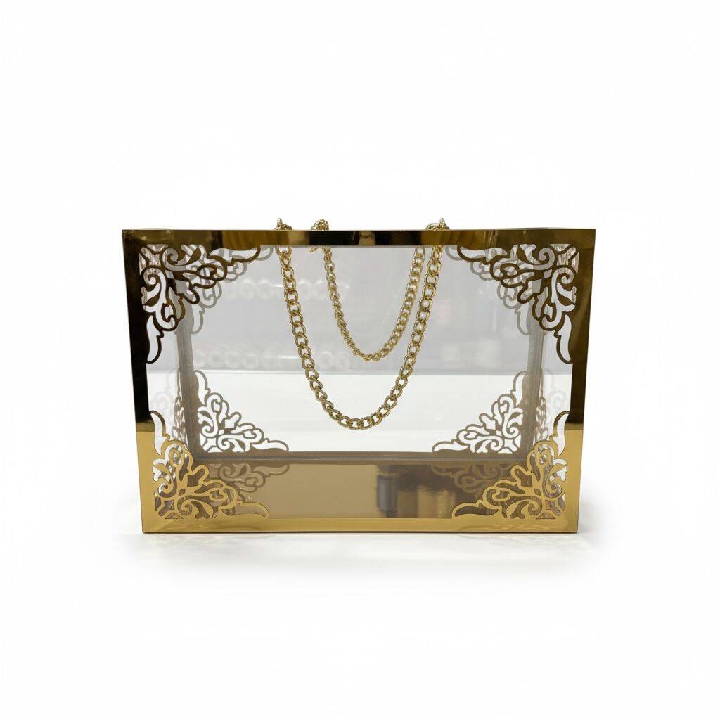Şeffaf Pileksi Çanta Zincirli Gold Yoğun Süslemeli