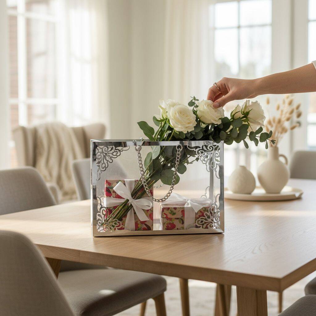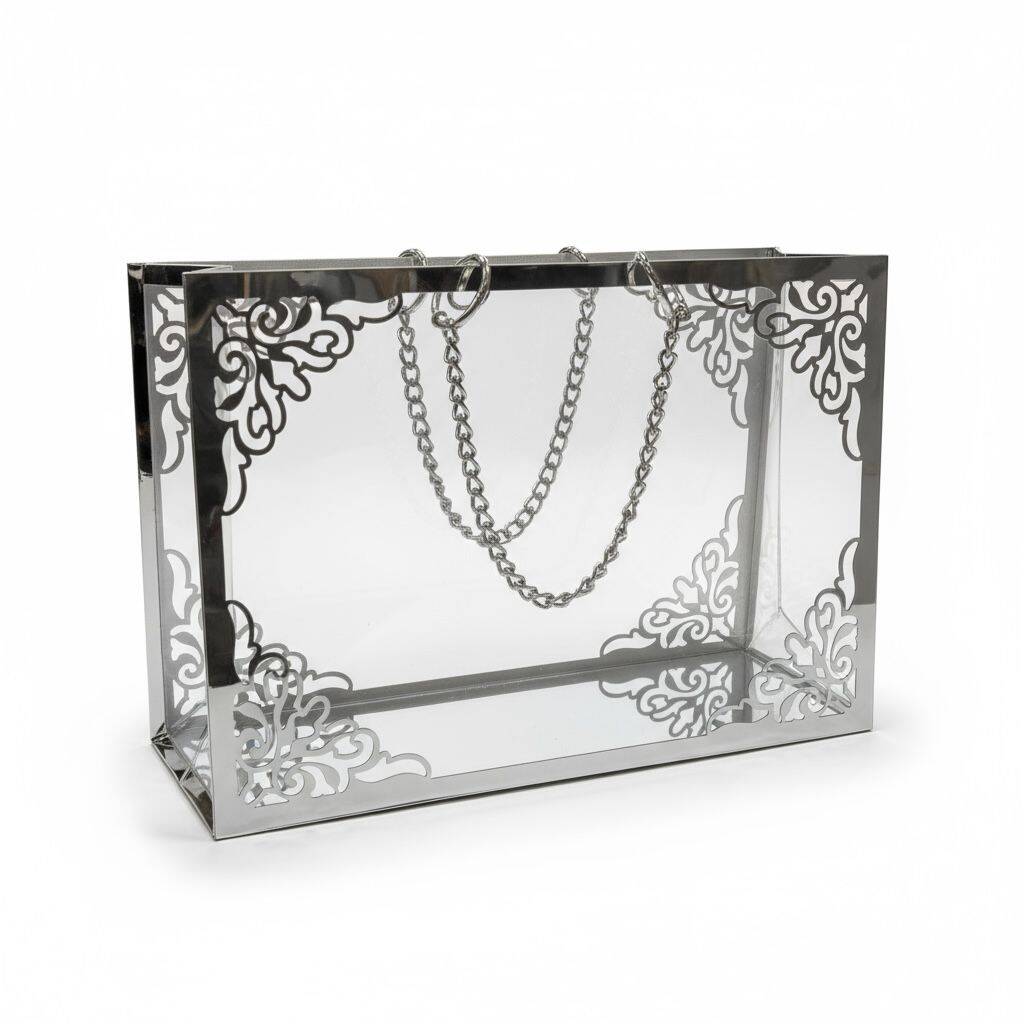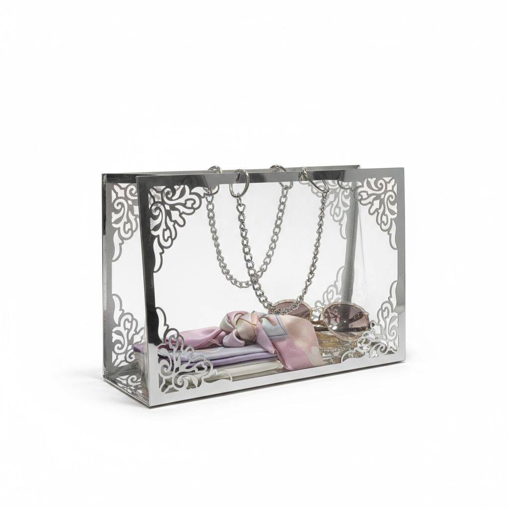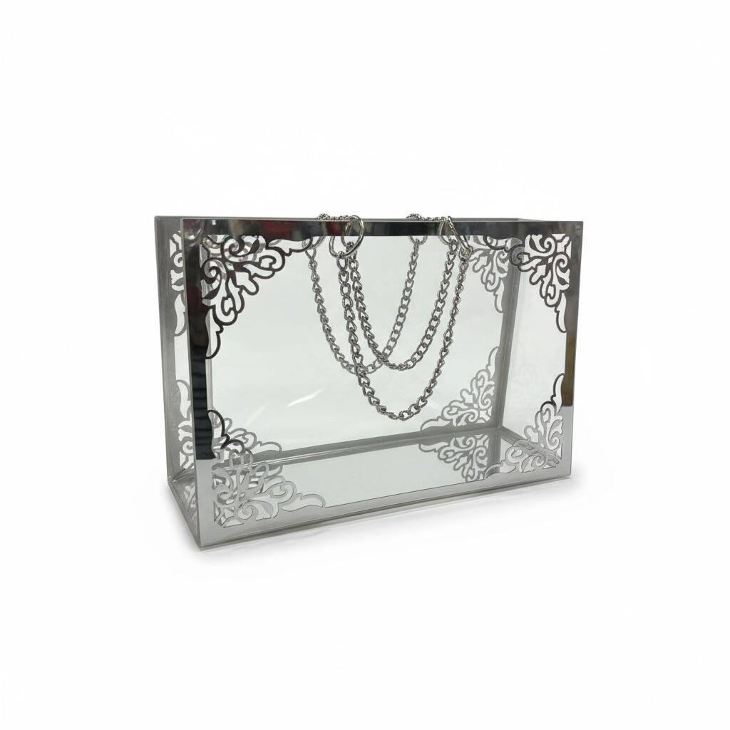 Şeffaf Pileksi Çanta Zincirli Gümüş Yoğun Süslemeli